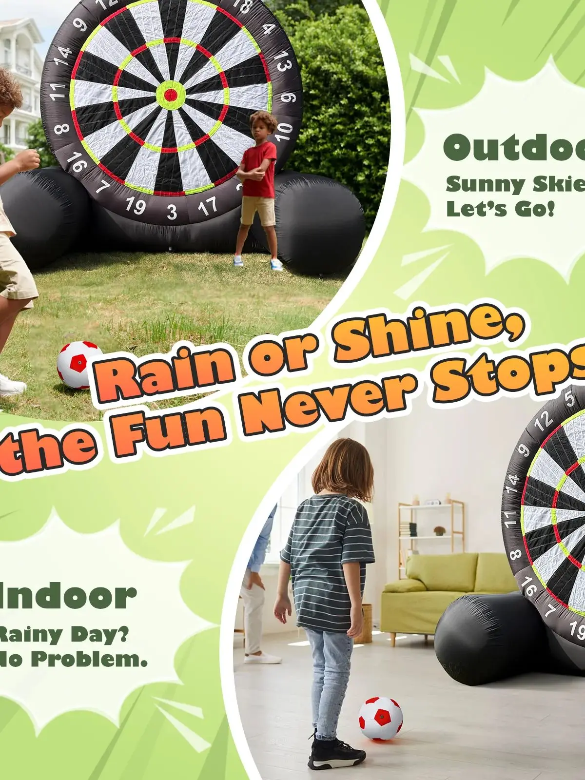 ⚽️ Built Tough, Thrill-Packed! 💪 The giant inflatable dart board is designed with a solid trapezoidal frame for unbeatable stability. Made from premium 210D black Oxford fabric, it's durable, weather-resistant, and tear-resistant. Enjoy a high-quality, long-lasting game that withstands all conditions.