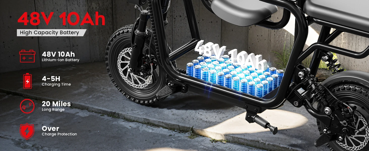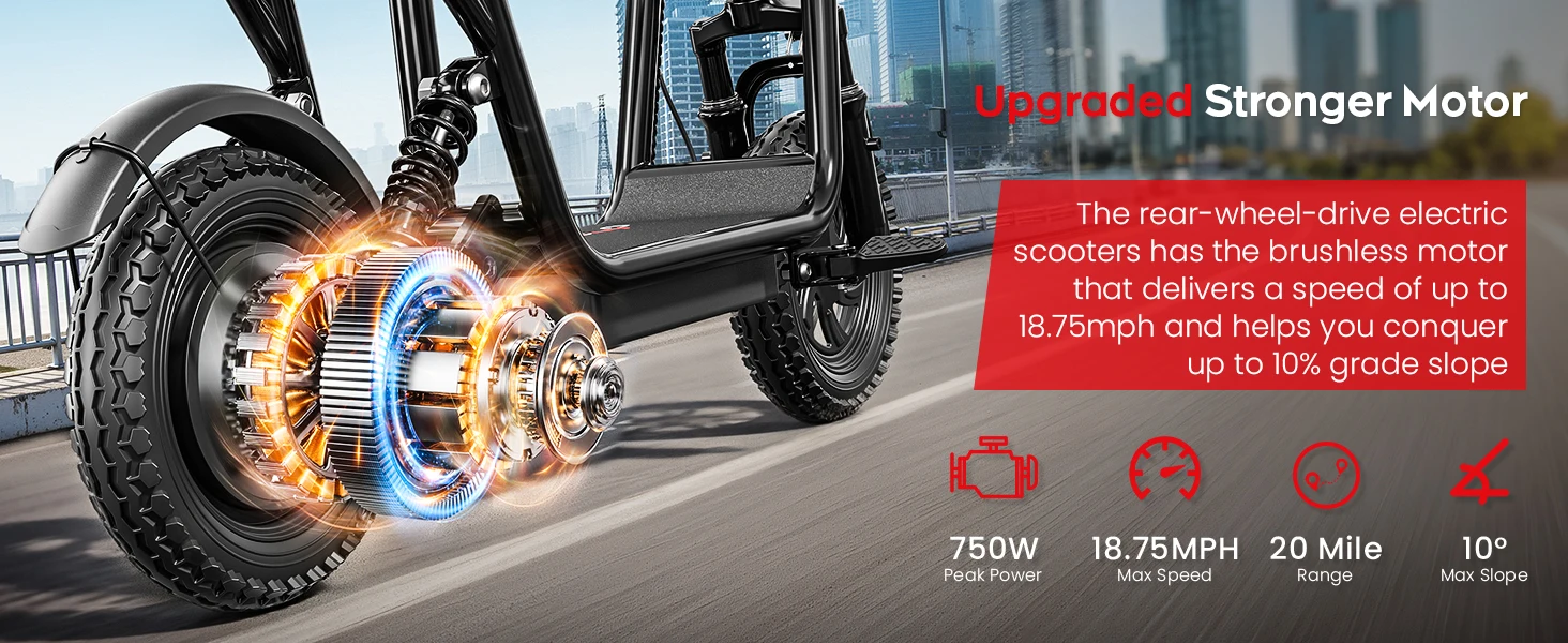 750W Powerful Motor&48V 10.4Ah Battery: The adult electric scooter features a 750watt rear-hub motor with a maximum speed of 18.64mph. Besides, it has 48V 10.4Ah high capacity battery with a range of 20 Miles, , ensuring enjoyable rides during daily commutes and short weekend trips.