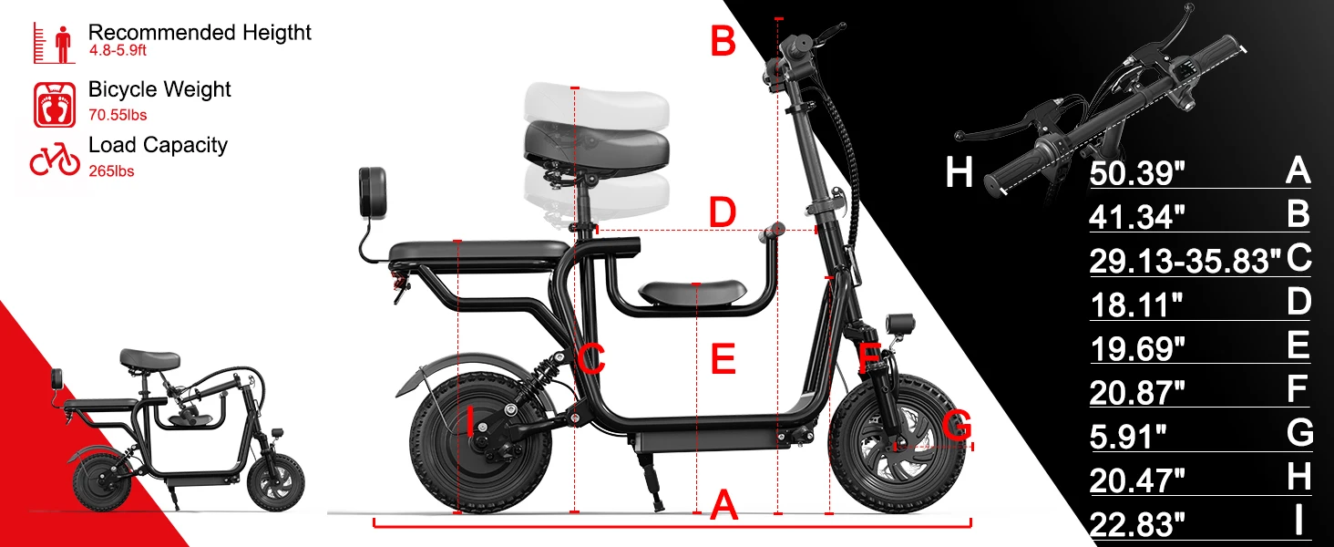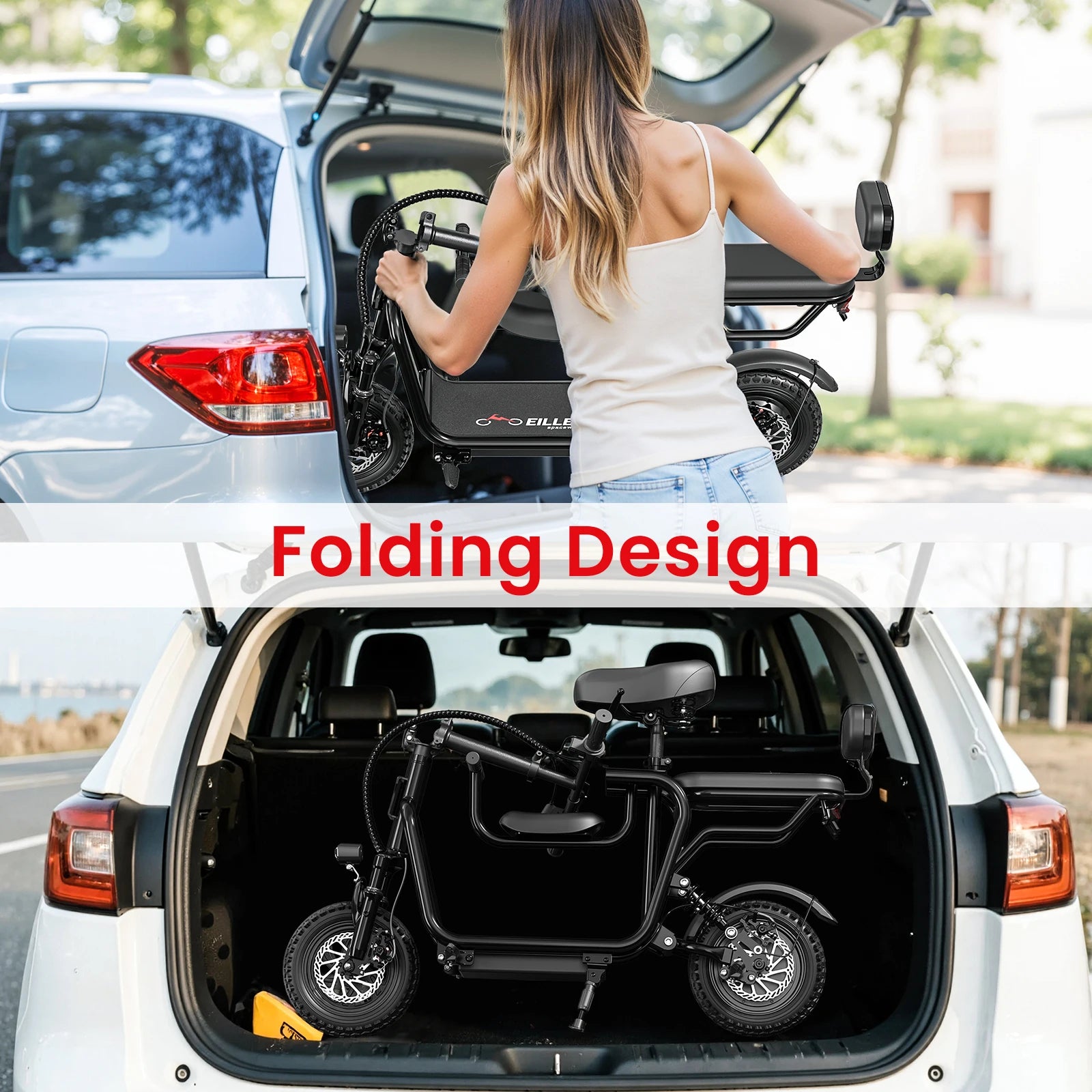 Electric Scooter With 3 Seats : Equipped with 3 Seats, the electric Scooter with seat can carry one child and two adults at the same time. Experience ultimate comfort while riding with the Electric Scooter, designed as an electric commuter bike for adults. The child's chair in front can be removable for more space to carry pets & cargo, making it versatile for various needs. Perfect choice for parents to take their kids to and from school, for a drive or for shopping!(Note: Basket sold separately)