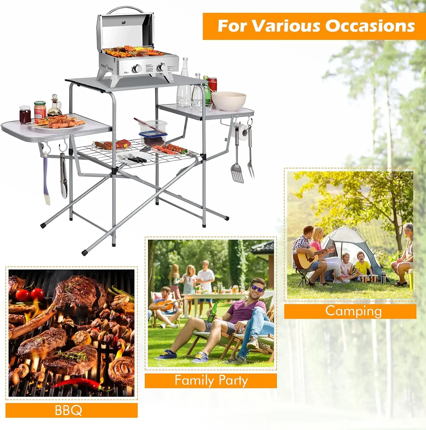 - You gain ample space with a 26'' x 16'' main tabletop plus two side tables and a lower shelf for gear, condiments, and trash.