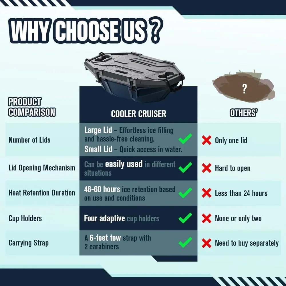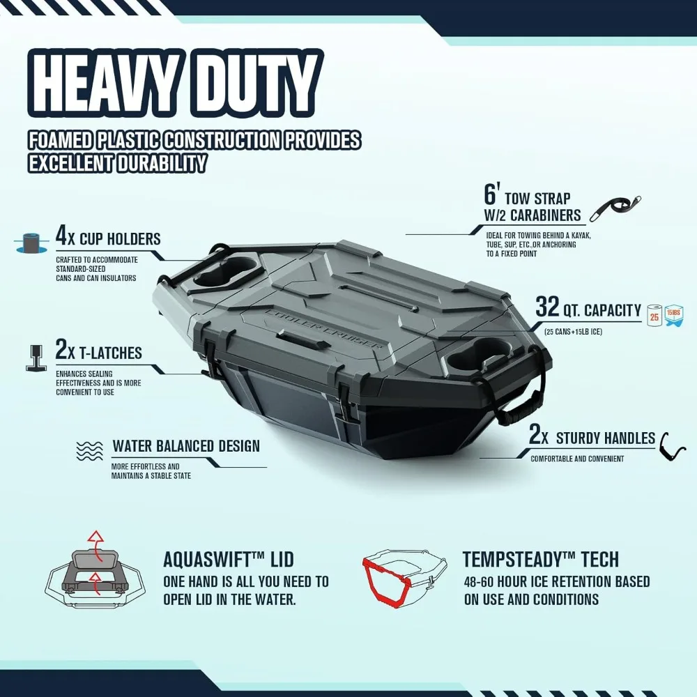 - Amphibious Ice Chest: Designed for water sports enthusiasts, it offers sturdy and durable performance for lakes, pools, beaches, and camping. Ideal for kayaking, boating, and rafting, it keeps drinks and snacks cool while you relax in pools, spas, or tubs. The Cruiser Cooler makes the perfect gift for water lovers and is essential for fun activities on both land and water.