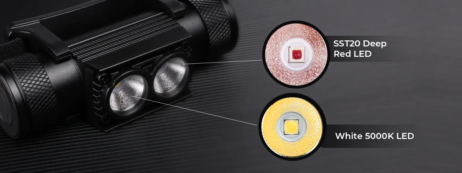 1. High CRI White & Deep Red Emitters: The H25LR headlamp utilizes dual LED Emitters. One of which is the LH351D 5000K CRI 90 High for a nice comfortable white beam. The other LED Emitter is the SST20-DR Red LED, which produces red light in the wavelength of 660nms which helps to protect your night vision.