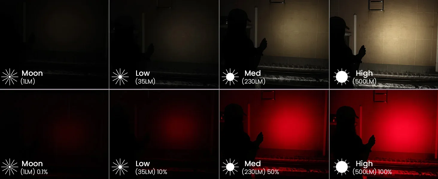 4 .Brightness Modes of: Moon-Low-Medium-High. You can also operate it a second way. From Off: Hold the power button to the flashlight turn On. Then release and hold the power button again to cycle through the 4 Modes of: Moon-Low-Medium-High. Then from On: Click to Turn Off.
