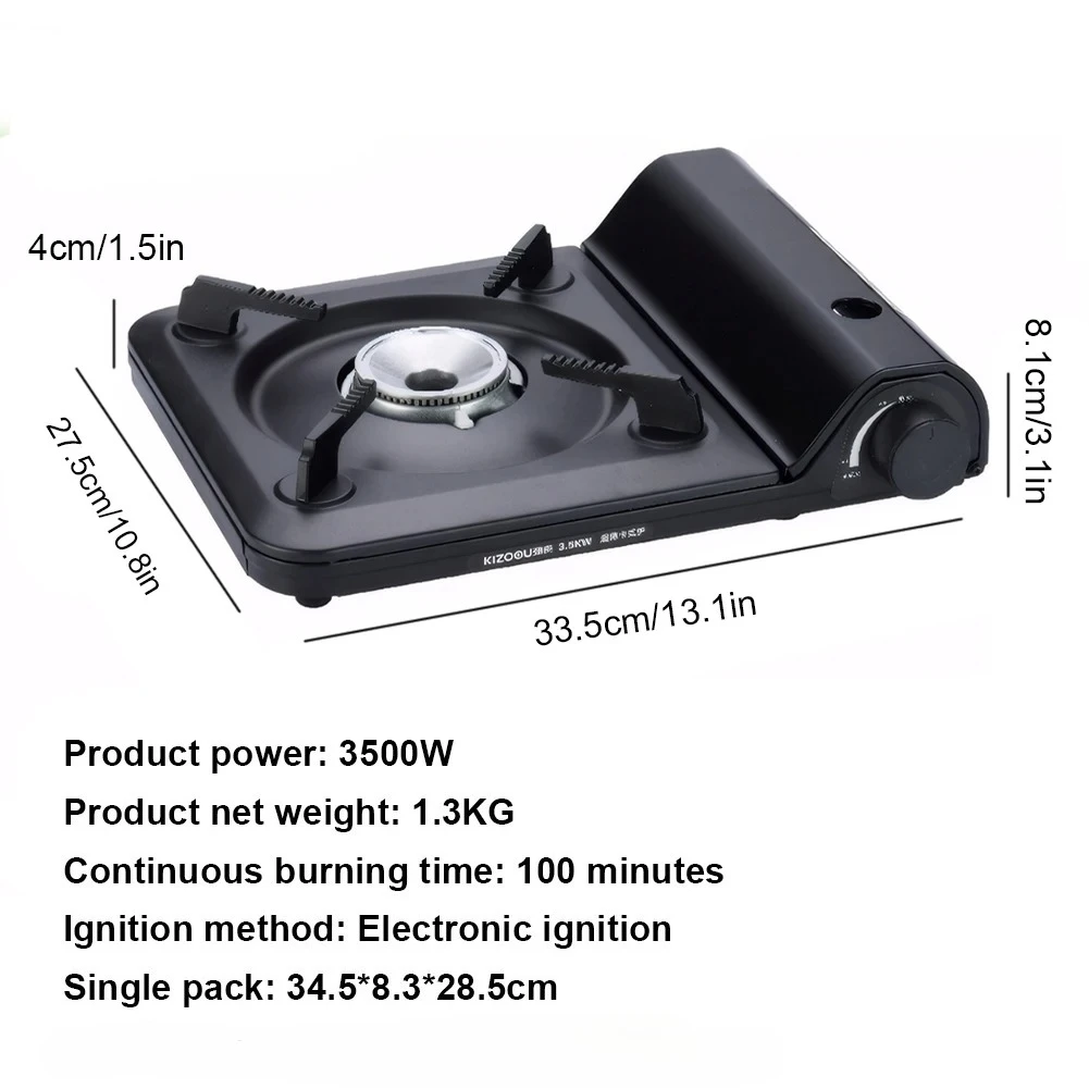 - Wind-resistant, ultra-compact single-burner cassette stove that uses standard butane cartridges—packable and portable (335x275x81 mm / 13.2x10.8x3.2 in; ~1.3 kg). Its rugged stainless steel body resists corrosion, cleans easily, and it supports medium-to-large pots for camping, hiking, hot pots, BBQ, or emergencies.