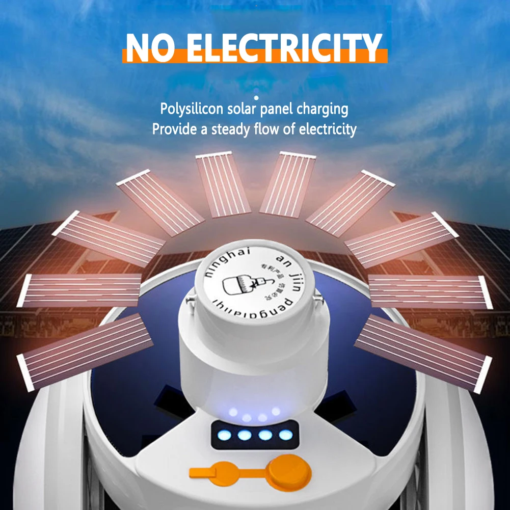 | 500LM Outdoor Hiking Tent LED Solar Soccer Light Bulb Searchlights USB DC Rechargeable Portable Lantern Emergency Night Lamp Flashlight Camping Supplies Feature: 1. Solar energy + USB charging. 2. Power display. Third, fifth gear light adjustment. 4. Charge protection. 5. It has its own hook for easy use. 6. The soft light mask emits light evenly and softly, and the 360 °lighting is not dazzling. 7. Deformable design: the lighting mode can be adjusted and the lighting range can be changed. Specification: Name: solar soccer lights camping lights Material: PVC Color: white Size: about 140x115x115mm/5.51*4.53*4.53in Net weight: about 350g Light color: white light Light beads: LED Brightness: 500LM Light gear: five gears, high bright, medium bright, low bright, flashing, SOS Battery capacity: 1200mAh lithium-ion battery (shipping includes battery) Charging method: solar + USB DC charging Waterproof rating: IPX4 daily waterproof Note: Due to the different monitor and light effect, the actual color of the item might be slightly different from the color showed on the pictures. Thank you! Please allow 1-2cm measuring deviation due to manual measurement. 1 X Camping Light 1 X Charging Cable |