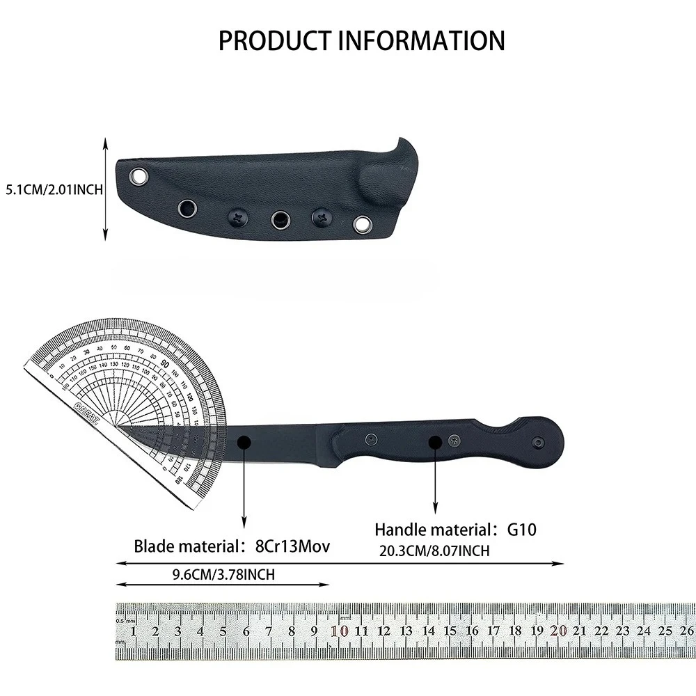 - 9.6 cm stainless steel blade (8Cr13Mov) with a sharp edge and 3.9 mm thickness, designed for you to perform durable cutting across camp chores, utility tasks, and light batoning.
