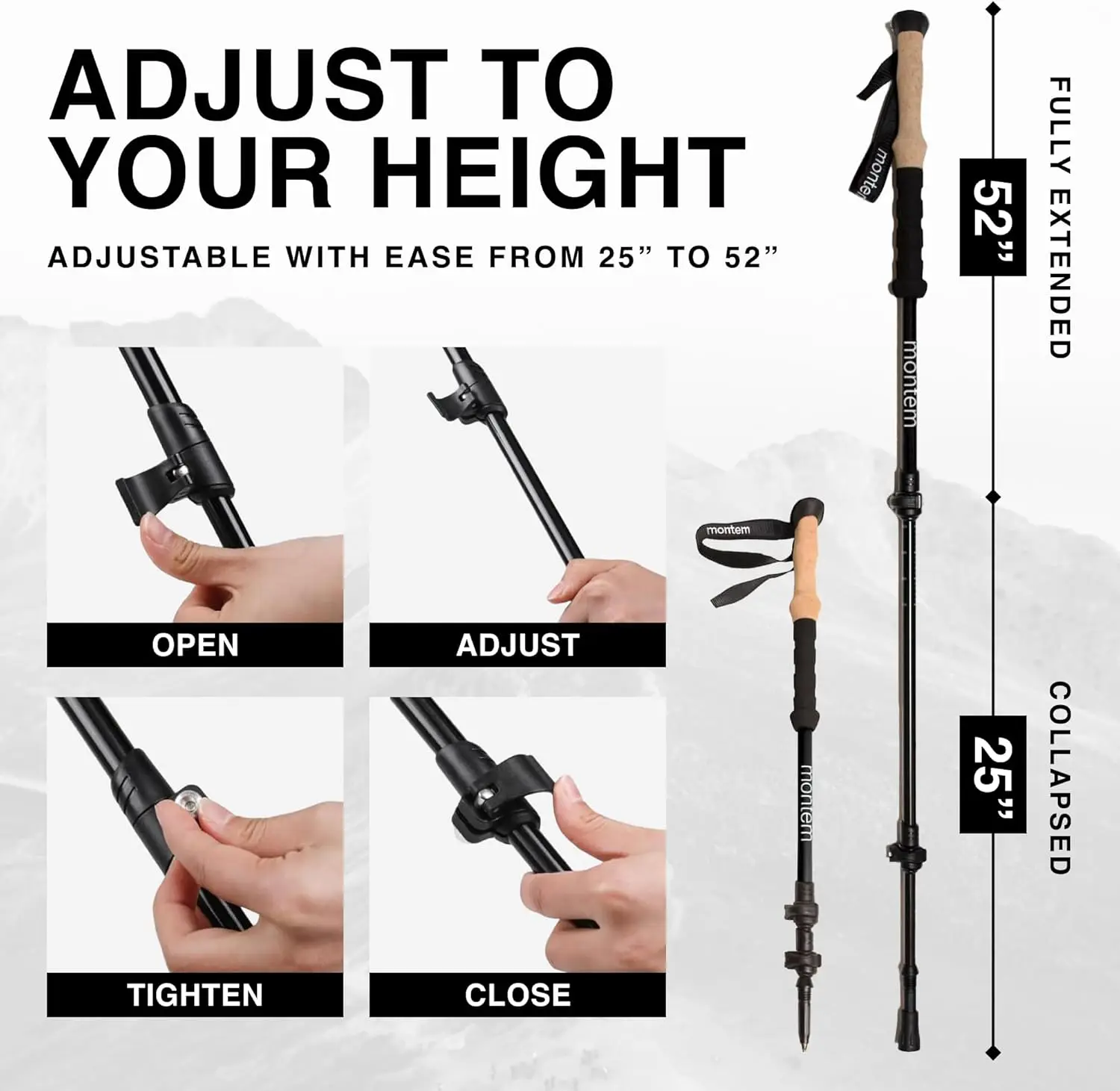 Discover the perfect companion for your outdoor adventures with our premium trekking poles. Designed to enhance your hiking, walking, and trekking experiences, these poles combine strength, convenience, and comfort in one sleek package. ✅【TOP-RATED PERFORMANCE】Praised by leading outdoor magazines as an excellent value choice, these carbon fiber poles have been tested on thousands of miles across rugged terrains like New Zealand. We prioritize quality without compromise, ensuring you get reliable gear that stands up to the toughest conditions. ✅【ULTRA STRONG & LIGHTWEIGHT】Crafted from 100% carbon fiber—the same high-tech material used in aerospace applications—each pole weighs just 7.6 ounces. This ultra-light design reduces fatigue so you can focus on your journey, not your gear. Backed by a lifetime replacement promise for added peace of mind. ✅【EASILY ADJUSTABLE】Featuring quick-lock mechanisms, these poles allow you to swiftly adjust the length from 24 inches to 53 inches. Find your ideal height in seconds for optimal support on any trail or terrain. ✅【COMPACT & TRAVEL-FRIENDLY】Designed for easy storage and transport, these foldable poles fit neatly into luggage, backpacks, or duffle bags. They come with handy accessories like rubber tip protectors to prevent damage and mud baskets for enhanced grip in wet conditions. ✅【COMFORTABLE & STABLE GRIP】Equipped with padded straps and ergonomic handles, these poles provide a secure and comfortable hold throughout your hikes. Say goodbye to slipping or dropping—enjoy stable support that keeps you steady on uneven paths. Ideal for hikers, walkers, and trekkers of all levels, these weather-resistant poles are built to last through seasons of use. Whether you're exploring local trails or embarking on international adventures, trust in their durability and performance to elevate every step.
