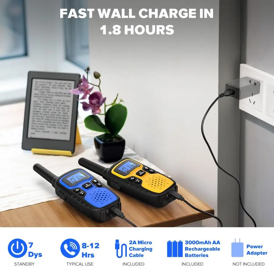 UNLIMITED COMMUNICATION TIME The rechargeable walkie talkie supports micro USB charging. You can charge them indoors, on the road, and even camping and hiking, and you do not need to pay for batteries, again and again, saving stress and money for you.